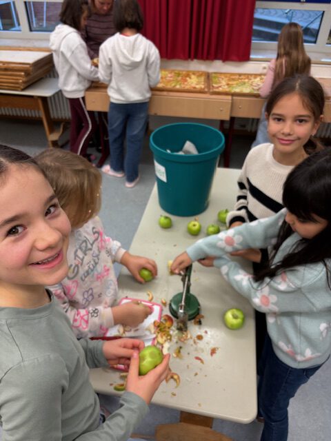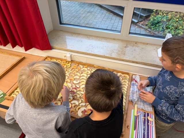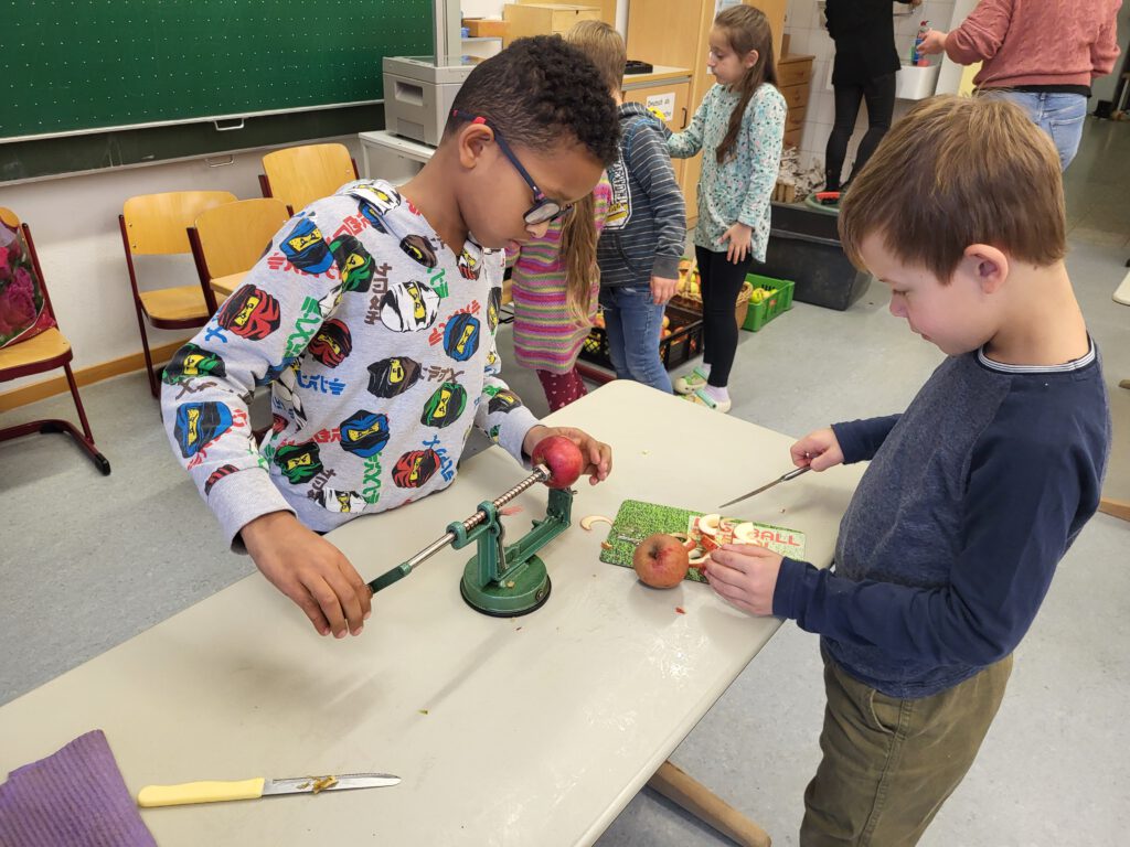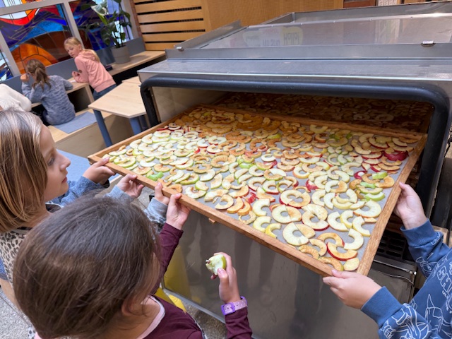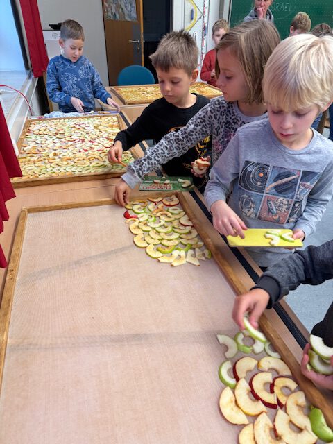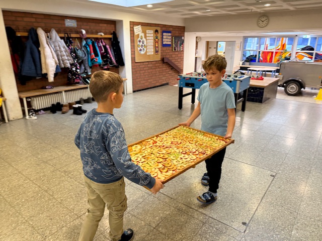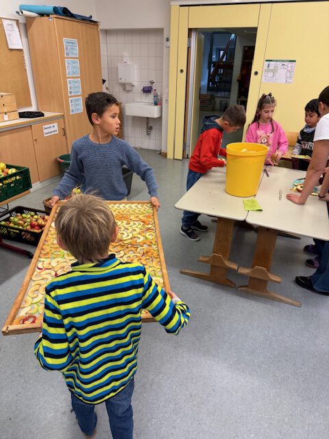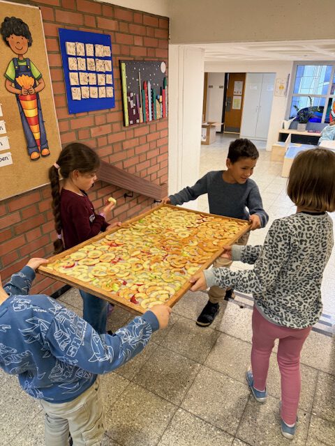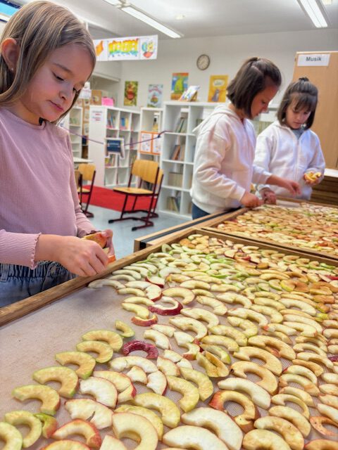 Nach dem Äpfel pflücken am vergangenen Freitag begannen wir gestern mit der Apfeldörre. Es hatten sich erneut sehr viele Eltern zum Helfen angemeldet und so kamen alle Klassen gut voran. Der Dörrautomat war schnell gut gefüllt. Heute Früh konnten nun alle Kinder die leckeren Apfelchips probieren. Herzlichen Dank an alle Helfereltern, sie sind für uns von unschätzbaren Wert!