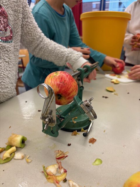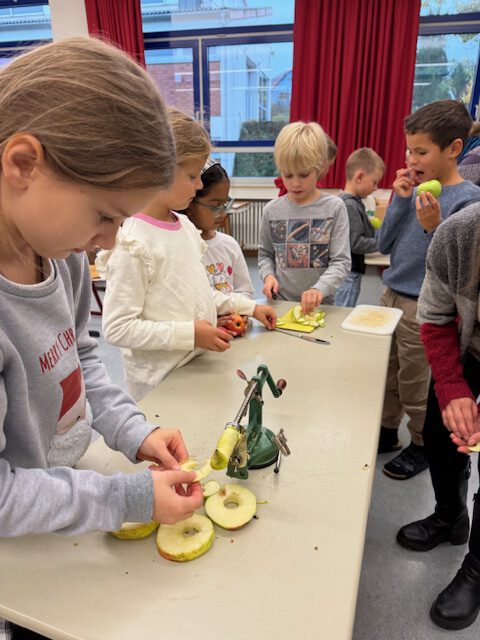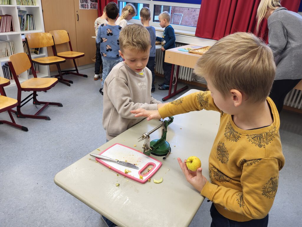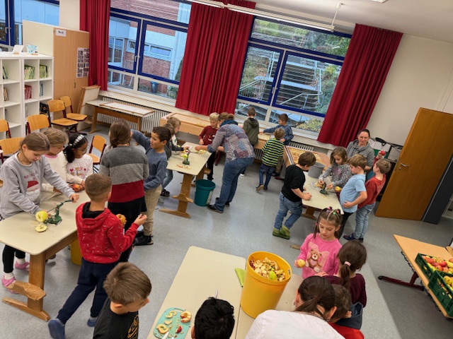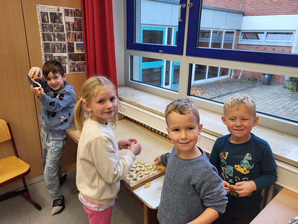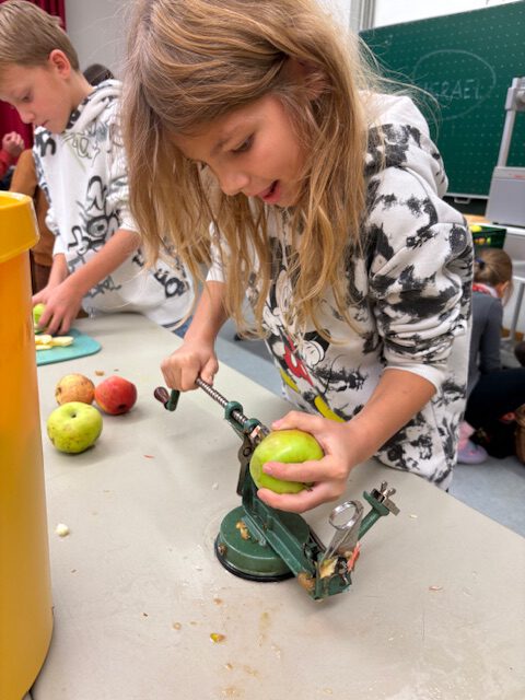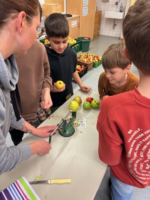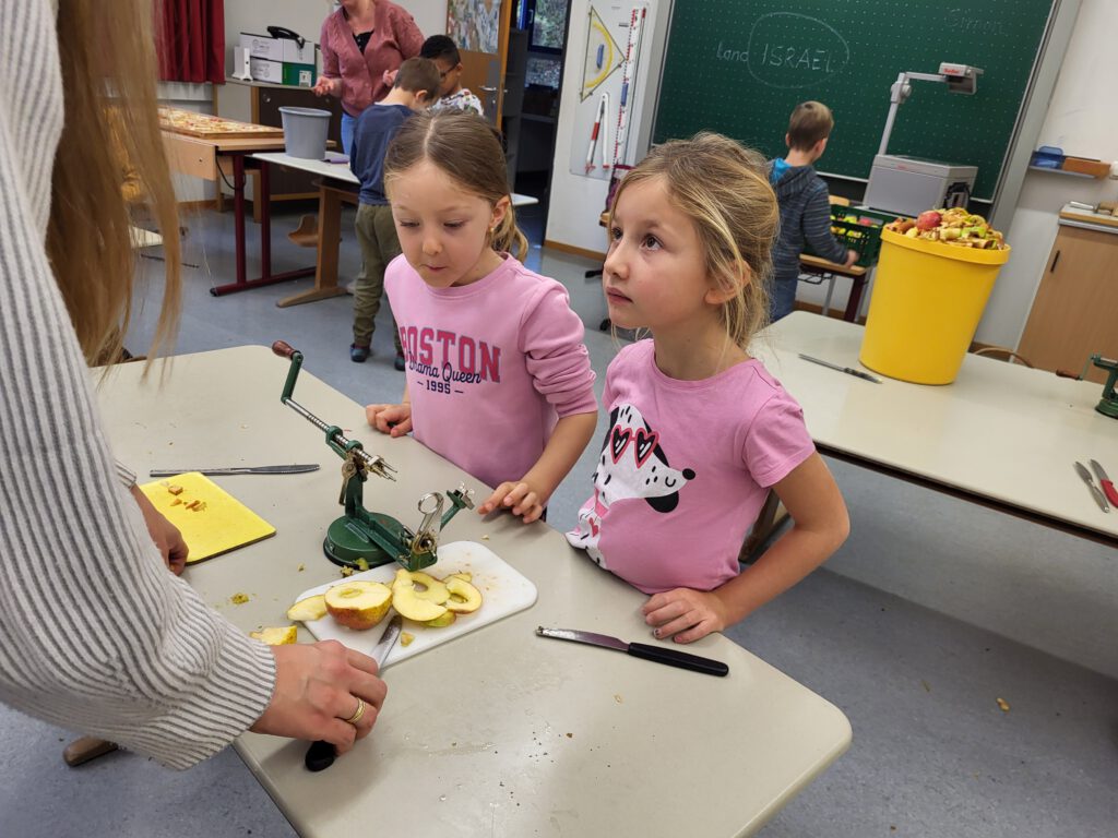Nach dem Äpfel pflücken am vergangenen Freitag begannen wir gestern mit der Apfeldörre. Es hatten sich erneut sehr viele Eltern zum Helfen angemeldet und so kamen alle Klassen gut voran. Der Dörrautomat war schnell gut gefüllt. Heute Früh konnten nun alle Kinder die leckeren Apfelchips probieren. Herzlichen Dank an alle Helfereltern, sie sind für uns von unschätzbaren Wert!