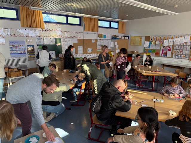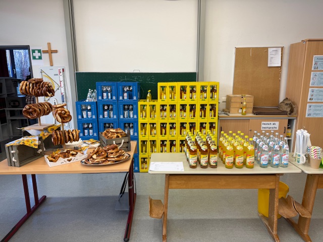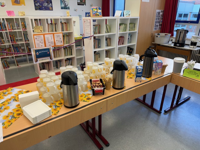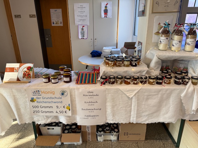 Für die sehr zahlreichen Gäste gab es reichlich zu essen und zu trinken. Darüber hinaus konnte man an den Verkaufsständen noch Kuchenrezpte im Glas, selbstgemachte Marmelade, Honig der AG Imkern und Umwelt, Topflappen, Plätzchen und das Schulkochbuch einkaufen.